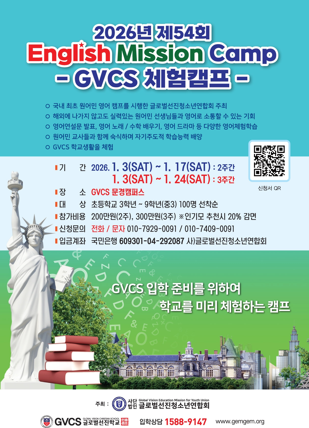 캠프는 2주(2026년 1월 317일) 또는 3주(1월 324일) 과정으로 진행된다. 장소는 GVCS 문경 캠퍼스다. 신청은 온라인 신청서를 통해 가능하며, 홍보 영상은 유튜브 (https://www.youtube.com/watch?v=R4VsFvuYV9Y)에서 확인할 수 있다.