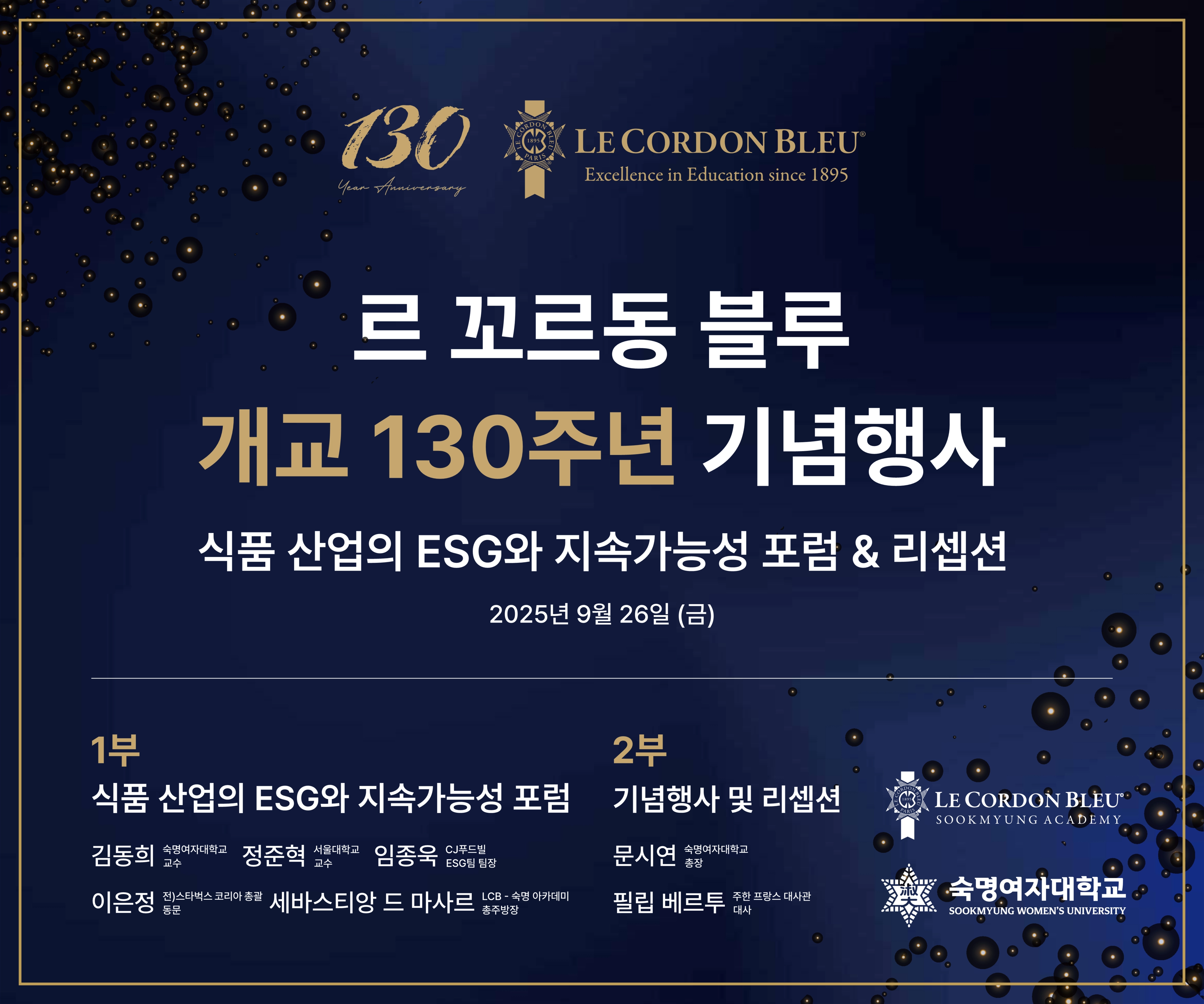 숙명여대는 르 꼬르동 블루의 한국 내 독점 파트너로서 2002년 한국 캠퍼스인 르 꼬르동 블루-숙명아카데미를 설립하고 현재까지 5000명이 넘는 미식 관련 전문가를 배출해왔다. 이번 행사에는 필립 베르투 주한프랑스 대사, 세바스티앙 드 마사르 르 꼬르동 블루-숙명아카데미 총주방장, 문시연 숙명여대 총장, 정상현 르 꼬르동 블루 숙명아카데미 원장과 국내 식품산업 및 ESG 전문가 등이 참석할 예정이다.