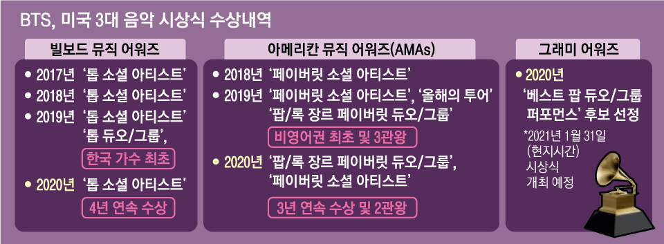 꿈쩍 않던 그래미 어워즈 벽 깼다… ‘그랜드슬램’ 넘보는 BTS