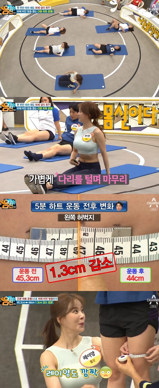 레이양은 “과거 상체 44, 하체 77 사이즈로 별명이 ‘코끼리 다리’였다. 하체에 쌓인 노폐물과 지방을 빼기 위해 ‘5분 하트 운동법’을 해 하체비만 탈출에 성공했다”고 말해 놀라움을 안겼다.