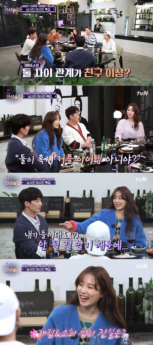 지난 10일 방송된 tvN 예능프로그램 ‘인생술집’ 남사친 여사친 특집에서는 윤소희 송재림, 장동민 신아영이 게스트로 출연하는 모습이 그려졌다.