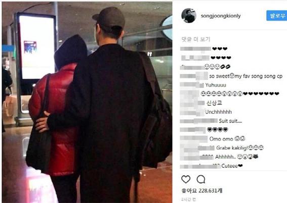 이날 송중기는 자신의 인스타그램에 검은색 코트에 백팩을 맨 송중기와 빨간 패딩 점퍼를 입은 송혜교의 모습이 담긴 사진을 올렸다.