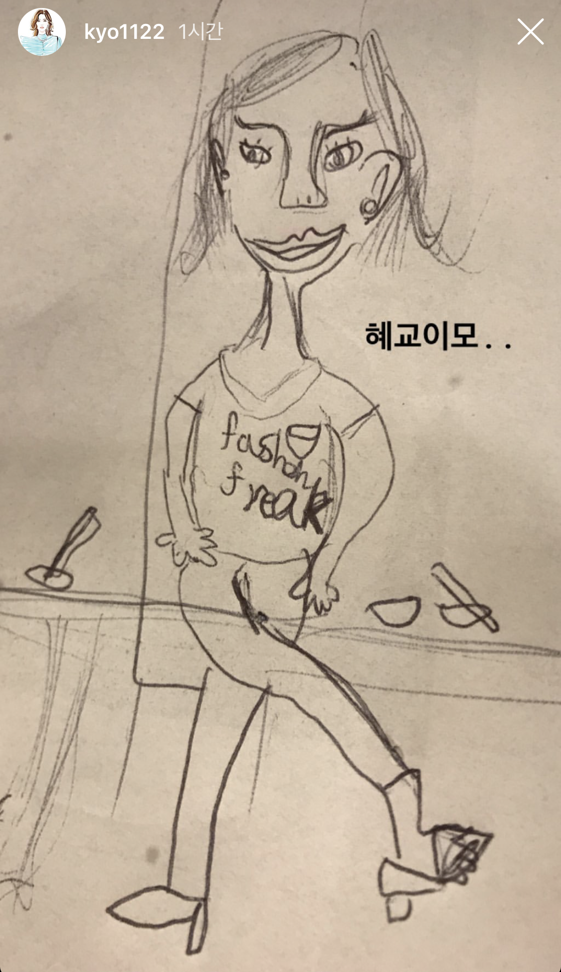 그림을 그리고 있는 조카의 뒷모습이 담긴 사진과 함께 “진지하시네요. 궁금하게”라는 글을 적었다. 이어 “혜교이모..”라는 글과 함께 완성된 조카의 그림을 공개했다. 다소 서툰 그림 솜씨로 송혜교의 미모를 담아내지 못해 웃음을 안긴다.