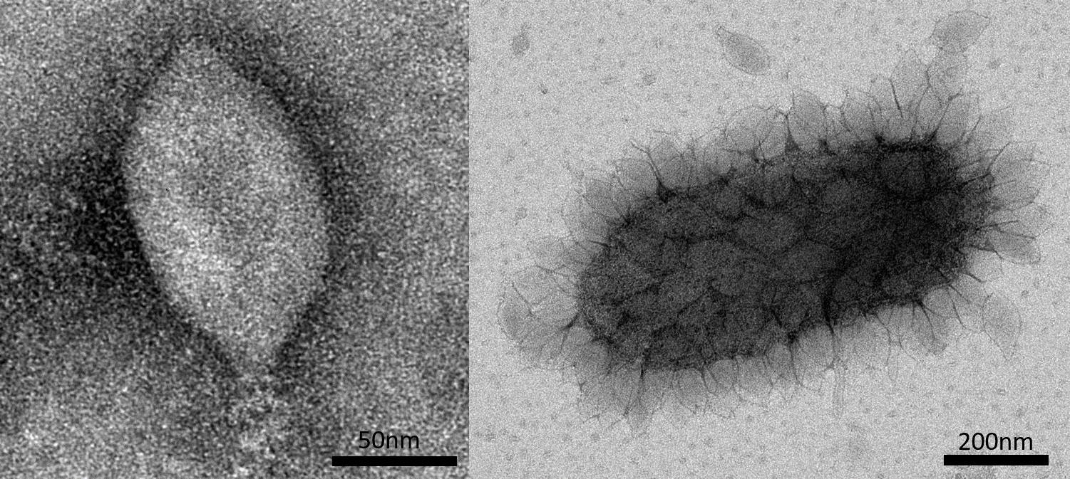 해양 고세균을 감염시키는 레몬(방추사)형태의 바이러스를 투과전자현미경을 통해 관찰한 사진(왼쪽). 감염 후 새로 생산된 바이러스가 숙주의 표면에 붙어 있는 것을 관찰할 수 있다(오른쪽).