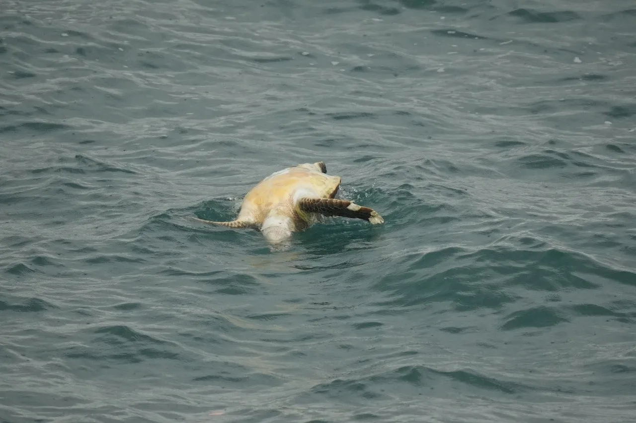 신고를 받고 출동한 해경은 간조때에 맞물려 해상에서 해안가로 떠밀려 온 84㎝ 크기의 푸른바다거북 사체를 인양해 확인한 결과 불법 포획 흔적은 발견되지 않았다. 다만 머리 부분에 낚싯줄 등이 얽혀 있는 점으로 보아 사인은 폐어구로 인해 희생됐을 가능성이 높은 것으로 추정되고 있다.