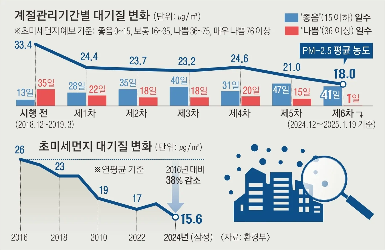PM-2.5 농도 개선은 산업·발전·수송 등 핵심 배출원에 대해 집중적인 저감 대책을 실시한 계절관리제 덕분이다. 도입 첫해 수도권에 국한됐던 배출가스 5등급 차량 운행 제한이 5차부터 대전·울산·광주·세종 등 특·광역시 전체로 확대됐다. 계절관리제 기간 배출가스 저감장치(DPF)를 부착하지 않은 5등급 차량은 운행할 수 없고 적발되면 하루 10만원의 과태료가 부과된다. 이를 통해 노후 경유차 약 100만대가 퇴출됐다.