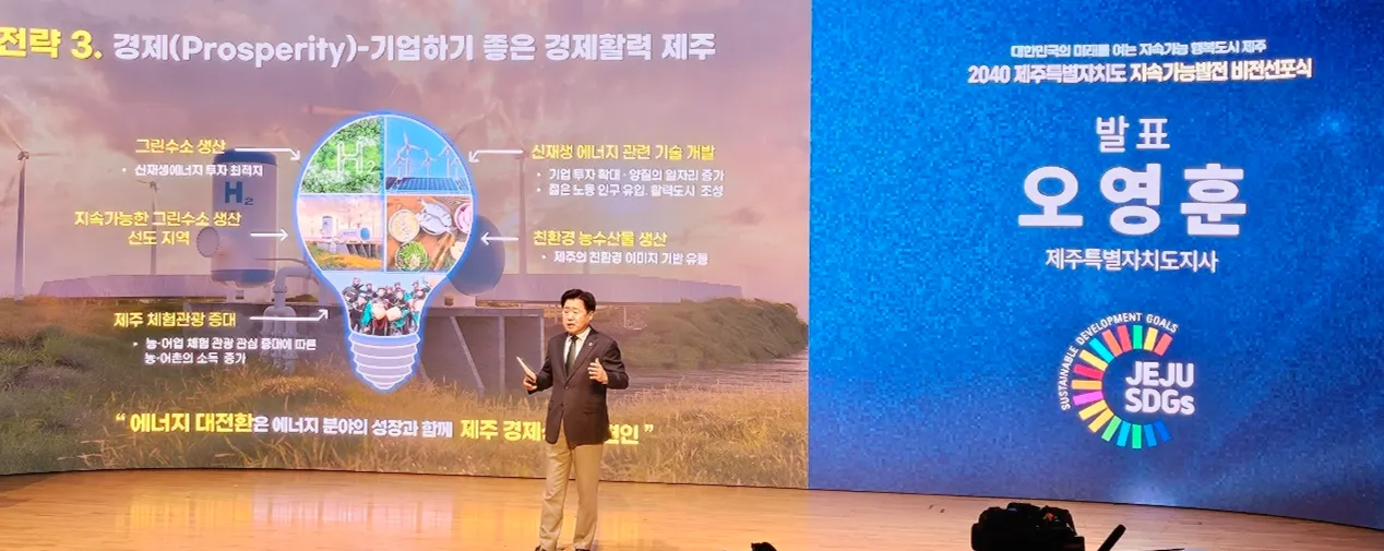 오영훈 제주도지사가 12일 설문대여성문화센터에서 열린 ‘2040 제주특별자치도 지속가능발전 비전 선포식’에서 “제주가 지속가능해질 수 있을까요”라고 자문하면서 해법을 제시했다.