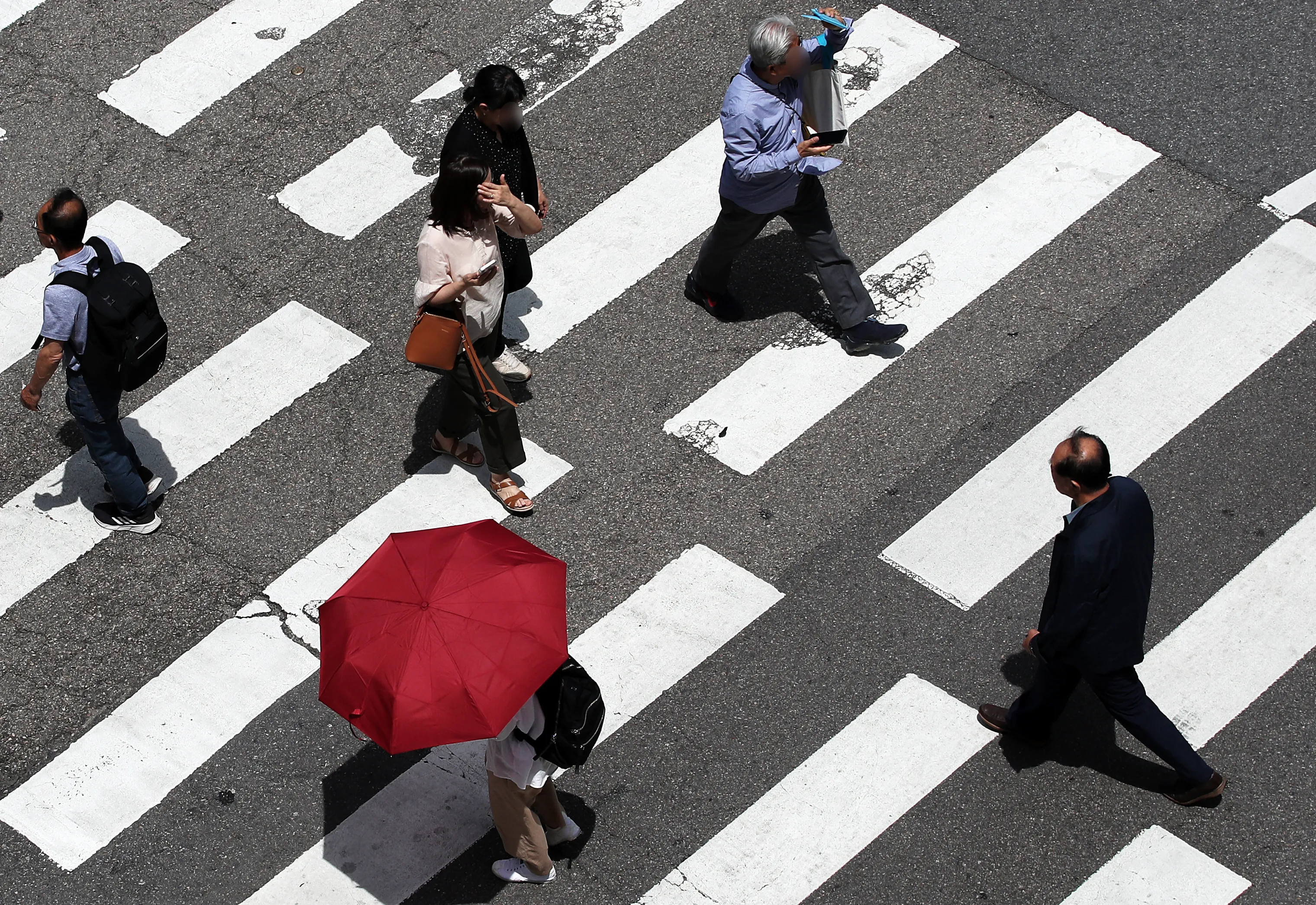 지난해 6월 서울 종로의 한 교차로 횡단보도에서 시민들이 양산과 손바닥으로 햇볕을 가린채 걷고 있다.