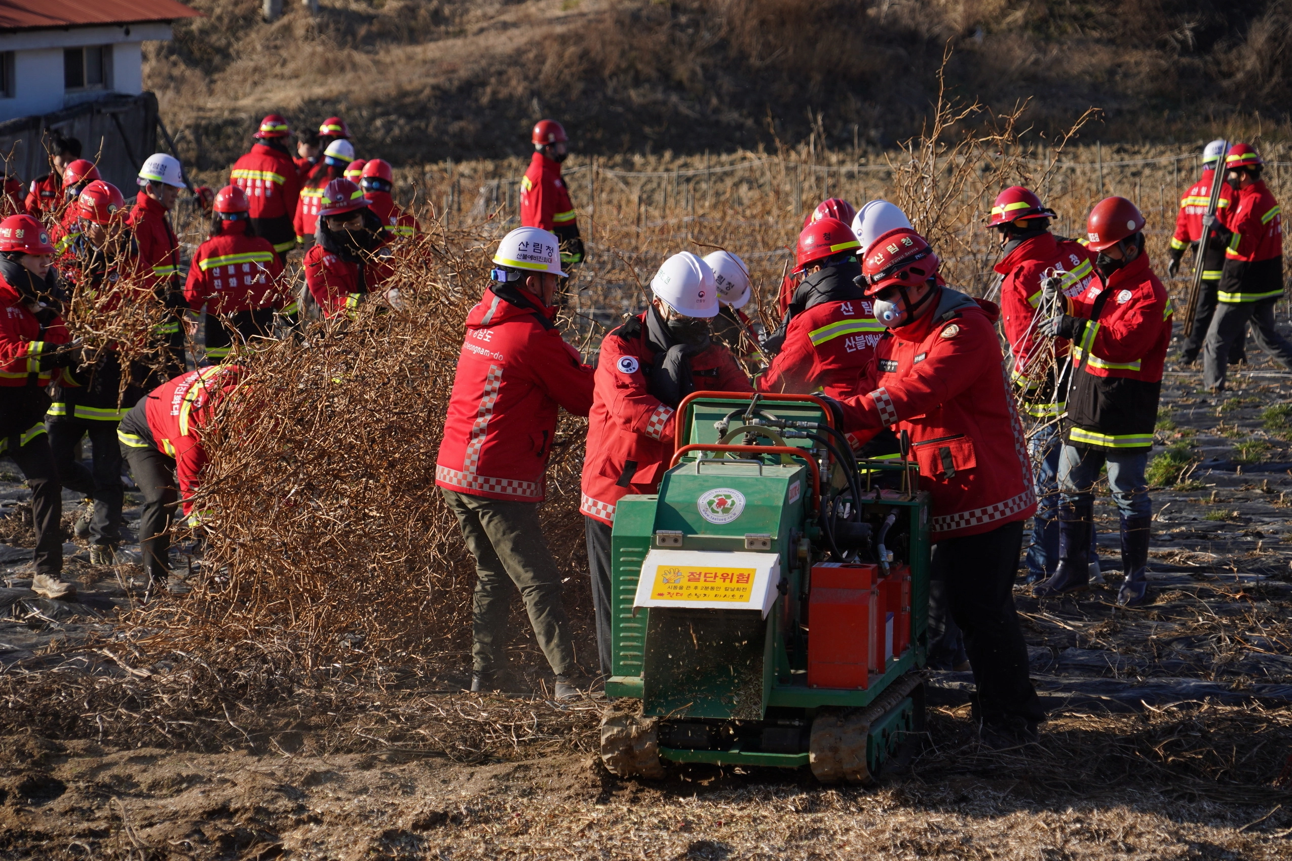 산림청이 봄철 산불의 주요 원인 중 하나인 영농부산물 소각에 대한 경각심을 높이기 위해 파쇄 현장에서 시무식을 가졌다. 지난해 사상 최대 산불 피해를 경험한 산림청은 산림재난 총력 대응 의지를 다졌다.