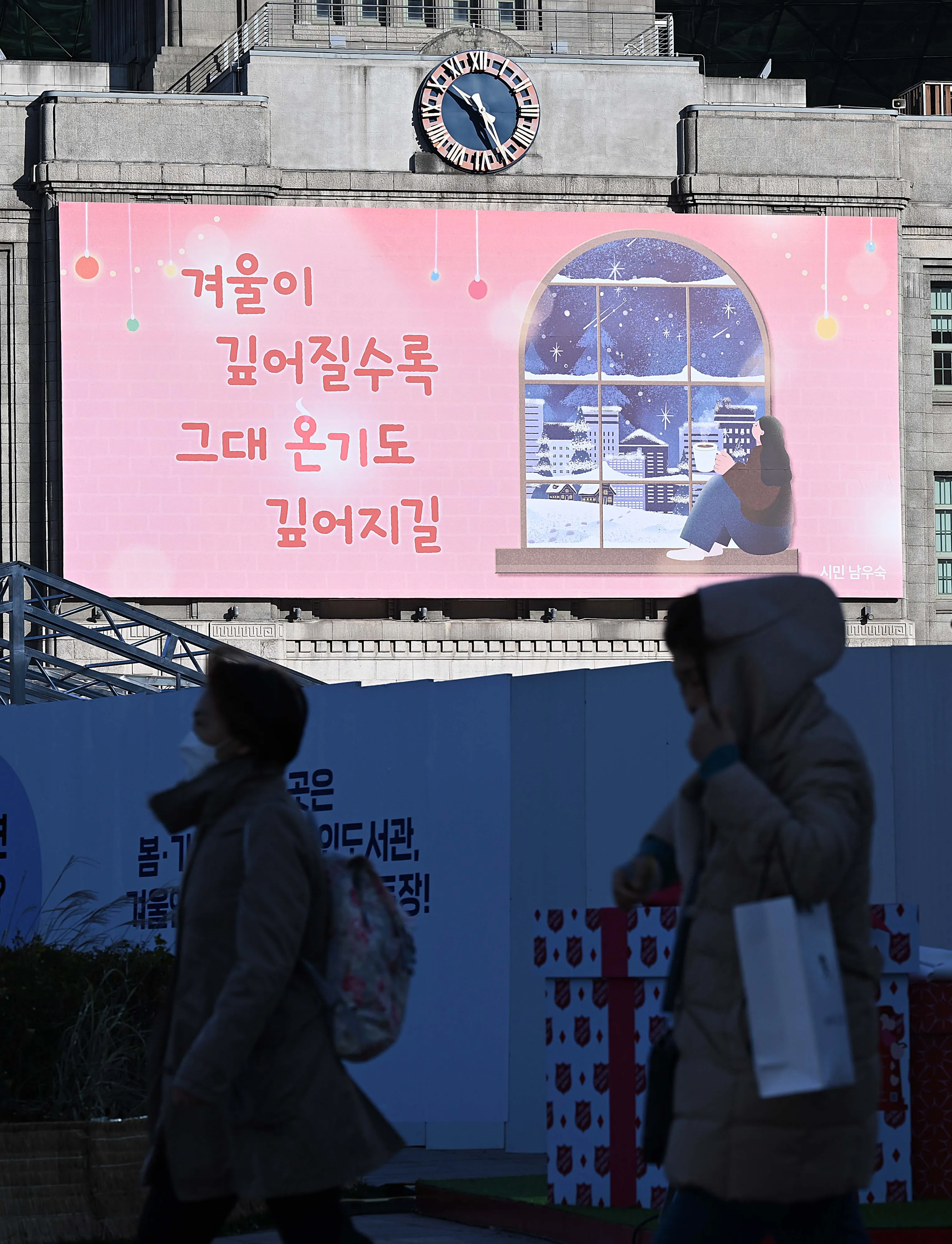 9일 서울 중구 서울도서관 외벽 대형 글판인 서울꿈새김판에 ‘겨울이 깊어질수록 그대 온기도 깊어지길’이라고 적힌 문구가 적혀 있다. 서울시는 앞서 ‘겨울을 맞아 새해에 대한 희망을 주는 글’을 주제로 공모전을 해 이 문구를 선정했다. 2024.12.9 오장환 기자