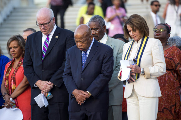 미국 민주당의 조셉 크롤리(앞줄 왼쪽), 존 루이스(가운데), 낸시 펠로시(오른쪽) 하원 원내대표가 14일(현지시간) 미 워싱턴 국회의사당에서 프랑스 니스 테러사건 희생자의 넋을 기리기 위해 묵념을 하고 있다. EPA연합뉴스