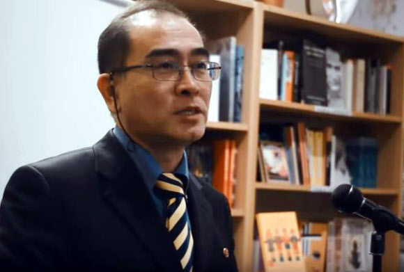 가족과 함께 제3국 망명을 신청한 것으로 알려진 영국 주재 북한 외교관이 선전을 담당하고 있는 태용호(Thae Yong Ho)라고 영국 BBC방송이 16일(현지시간) 보도했다. 사진은 태용호가 2014년 영국에서 강연하는 모습. 2016.8.17 [유튜브 캡처=연합뉴스]