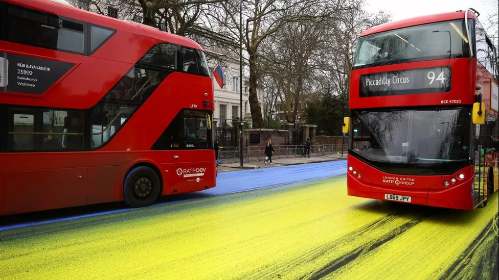 영국 런던의 2층버스들이 러시아의 우크라이나 침공 일년을 하루 앞둔 23일 아침(현지시간) 러시아 대사관 앞 도로가 우크라이나 국기 색깔인 노란색과 푸른색으로 칠해진 위를 달리고 있다.