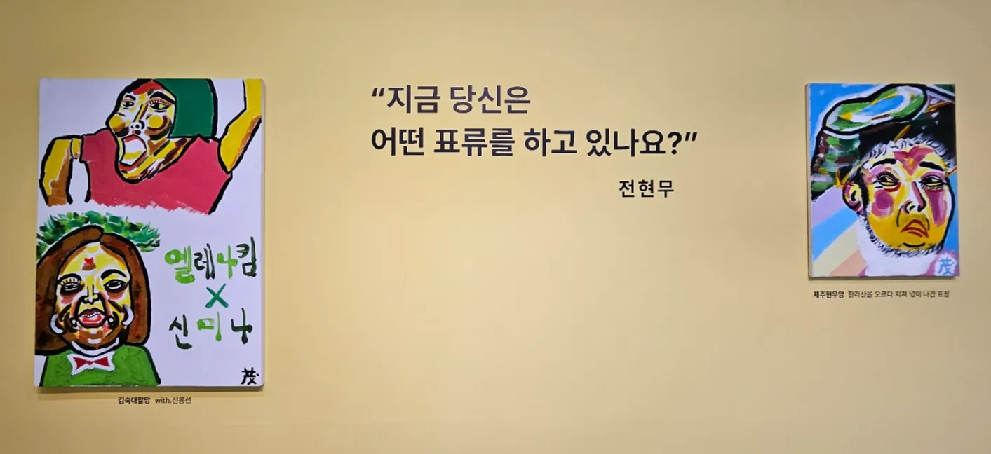 ‘제주현무암’은 한라산을 오르다 지쳐 넋이 나간 표정’의 전현무의 자화상이며 또다른 작품은 방송인 김숙과 신봉선을 모델로 그린 ‘김숙대할망 with 신봉선’이다. 제주의 한라산과 설문대할망의 신화를 유머러스한 방송인들의 캐릭터를 통해 풍자하는 듯 하다.