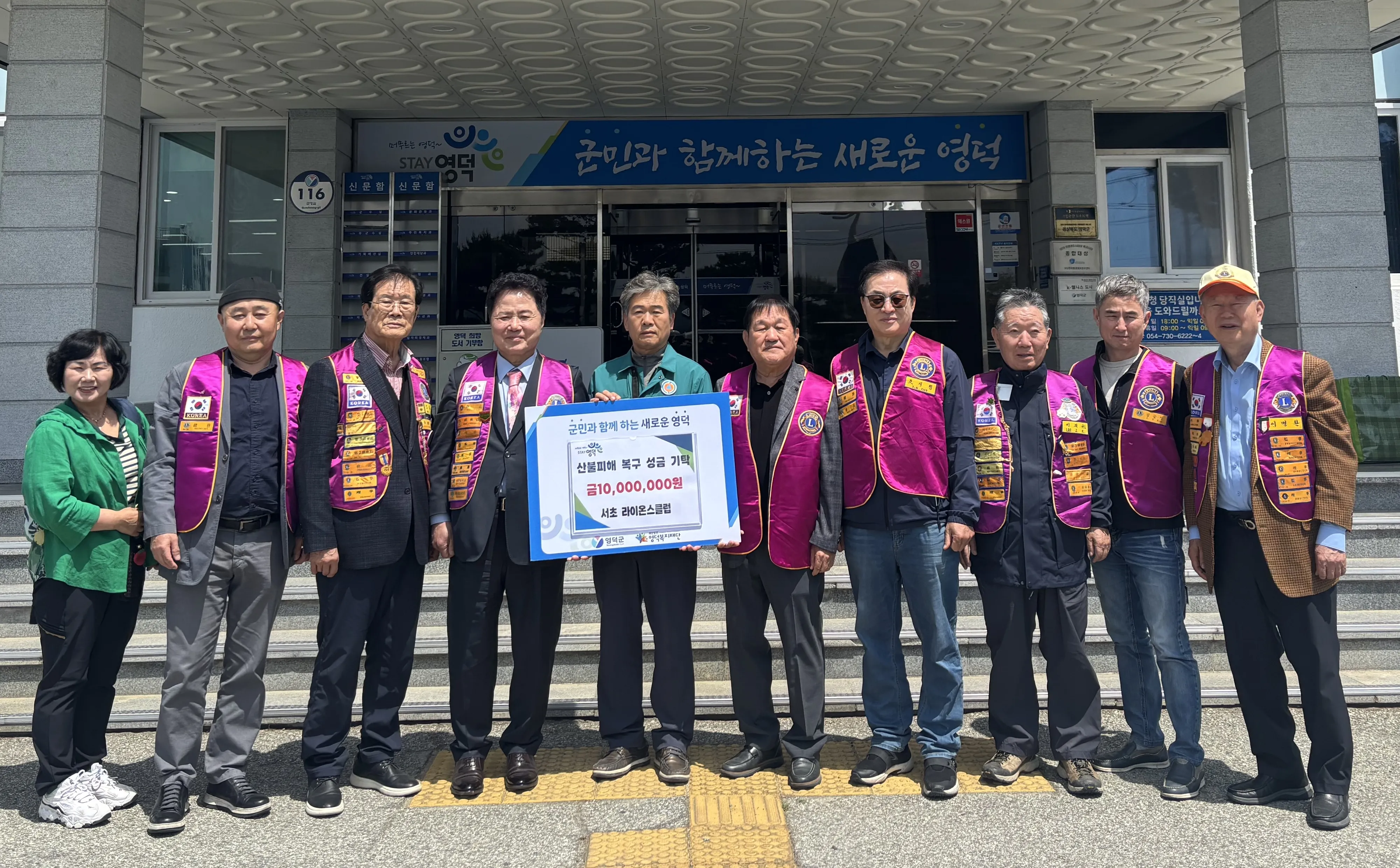 국제라이온스협회 354-D지구(서울 강남) 산하 서초라이온스클럽 도기서(78) 회장 및 클럽 회원들이 산불로 큰 피해를 입은 경북 영덕군에 성금 1000만원을 전달했다.