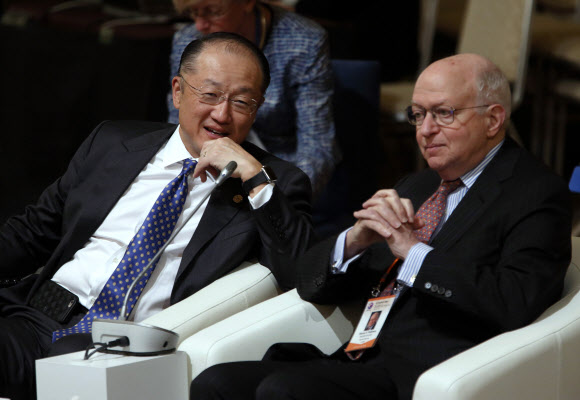 김용 세계은행 총재(왼쪽)와 마틴 펠드스타인 하버드대학교 경제학 교수(오른쪽)가 G7 재무장관회의가 개막한 일본 미야기(宮城)현 센다이(仙台)에서 열린 학술회의 ‘세계 경제의 미래’에 참석해 이야기를 나누고 있다.