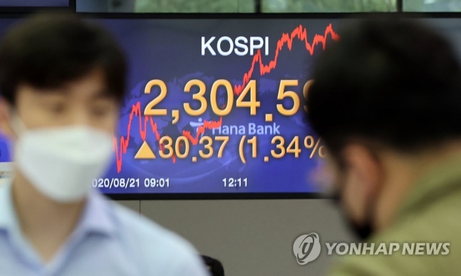 코스피 2,300선 회복 코스피가 전날보다 30.37포인트(1.34%) 오른 2,304.59에 거래를 마친 21일 오후 서울 중구 하나은행 딜링룸에서 딜러들이 대화하고 있다. 연합뉴스