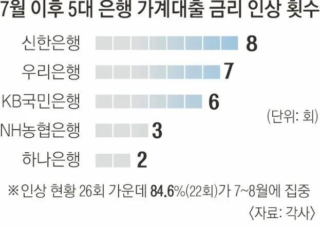 18일 KB국민·신한·하나·우리·농협 등 5대 은행은 올해 7월 이후 이날 현재까지 가산금리 인상 또는 우대금리 인하로 금리를 사실상 인상한 횟수가 총 26회 달하는 것으로 조사됐다. 신한(8회), 우리(7회), KB국민(6회), 농협(3회), 하나(2회) 등 순이었다.