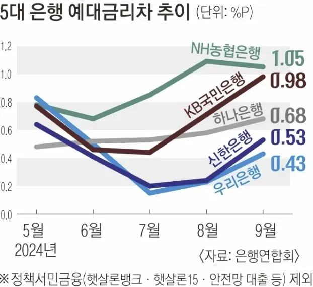 문제는 대출금리를 올리면서 예금금리는 내렸다는 점이다. 이를 입증하듯 은행권의 예대금리차(대출금리에서 예금금리를 뺀 값)는 갈 수록 커지고 있다. 은행연합회에 따르면 9월 5대 은행의 가계대출(정책서민금융 제외) 예대금리차는 평균 0.734% 포인트로 확대됐다. 지난 5월부터 3개월 연속 줄며 7월(0.43% 포인트) 저점을 찍었다가, 8월(0.57% 포인트)부터 두 달 연속 확대된 것이다. 농협은행은 5월을 제외하고 5대 은행 중 가장 예대금리차가 높았다. “주로 1~3개월 초단기 정기예금으로 예치되는 정부정책자금을 취급하는데, 수신금리가 낮아 예대금리차가 상대적으로 크게 나타났다”는 게 농협 측 설명이다.