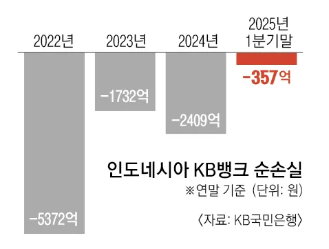 인도네시아 KB뱅크의 이번 자회사 매각 배경으로는 KB뱅크의 수익성 개선이 꼽힌다. 이날 국민은행에 따르면 KB뱅크는 올해 1분기 인도네시아 현지 회계 기준으로 3422억 6000만루피아(약 290억원)의 당기순이익을 기록하며 흑자 전환에 성공했지만, 국내 회계 기준상으로는 357억원의 순손실을 기록했다. 지난해 말 기준 순손실은 2409억원으로, 2023년 말(1732억원)보다 순손실 폭을 키우기도 했다.