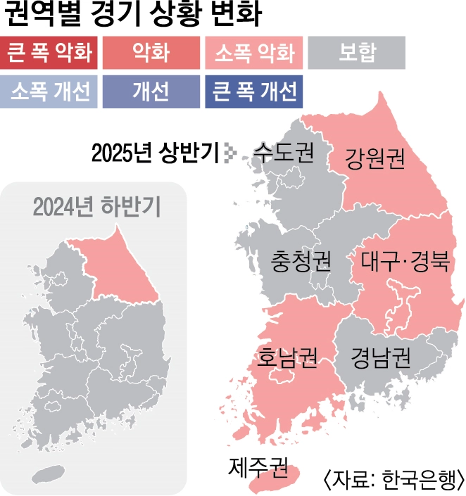 상반기 건설업의 경우에는 지난해 하반기 대비 모든 권역에서 부진했지만 “향후 금융 여건 완화와 더불어 추경 및 건설 경기 활성화 정책 등으로 인해 수도권과 충청권을 중심으로 부진이 다소 해소될 것”으로 기대했다. 호남권과 대구·경북은 감소세가 이어질 것으로 예상됐다.