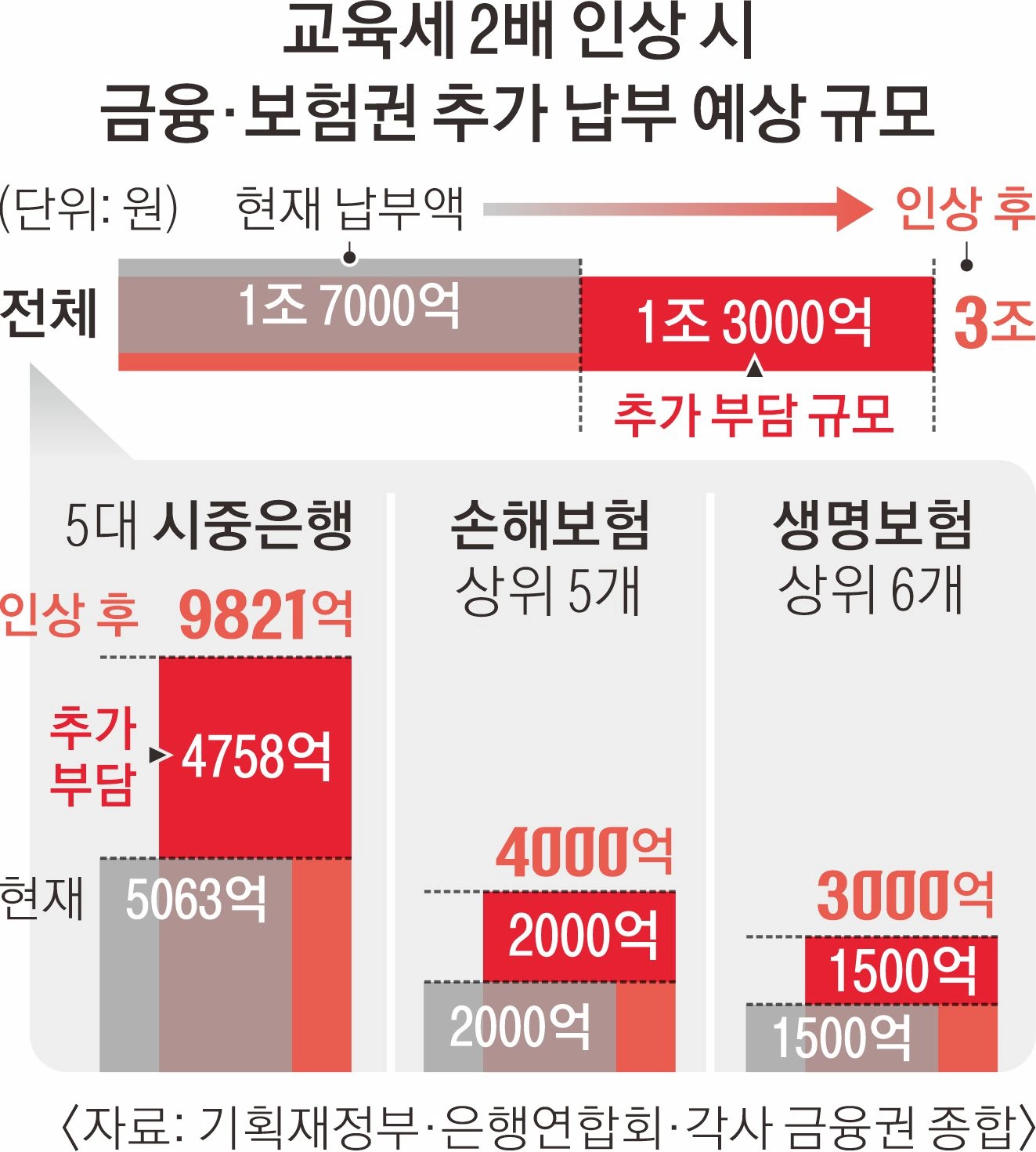 정부가 내놓은 교육세법 개정안이 국회를 통과할 경우 내년부터 주요 시중은행의 교육세 납부액이 연간 1조원을 넘어설 것으로 보인다. 보험·카드·저축은행 등 제2금융권도 조세 형평성 문제를 제기하며 반발에 나서면서 ‘횡재세보다 더한 참교육세’ 논란이 확산되고 있다.