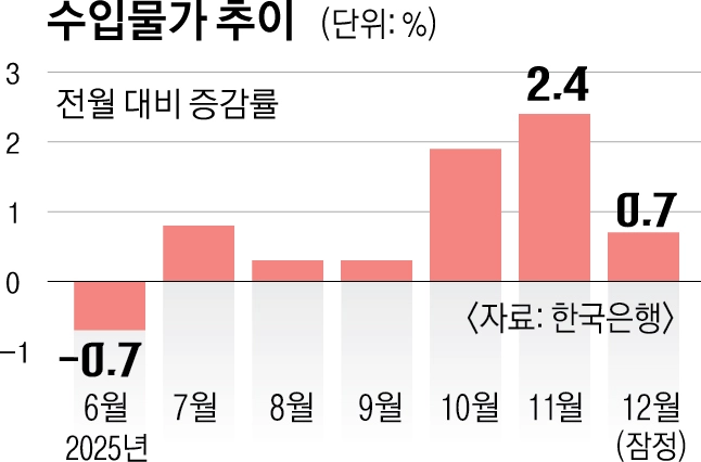 한국은행이 14일 발표한 ‘2025년 12월 수출입물가지수 및 무역지수(잠정)’에 따르면, 지난해 12월 기준 수입물가지수(원화 기준 잠정치·2020년 수준 100)는 142.39로 전월(141.47)보다 0.7% 올랐다. 전년 동월 대비로도 0.3% 올랐다. 수입물가지수가 전월 대비 6개월 연속 오른 것은 2021년 5월∼10월 이후로 4년 2개월 만에 처음이다.