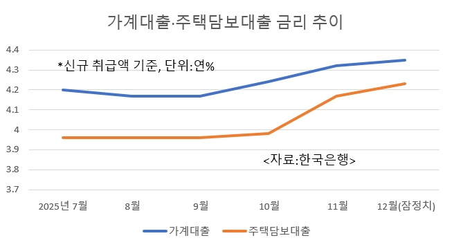 지난해 12월 은행권 가계대출 금리가 주택담보대출과 신용대출 금리 상승으로 3개월 연속 올랐다. 특히 일반신용대출 금리는 한 달 만에 0.4% 포인트 넘게 급등하며 1년 내 최고치를 기록했다.