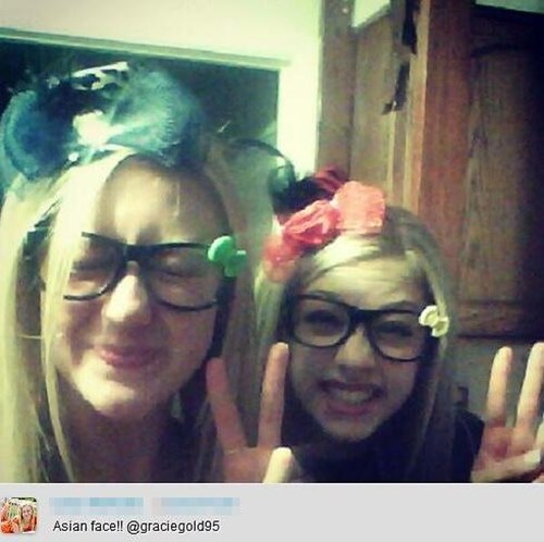 사진 속 그레이시 골드는 친구와 함께 뿔테 안경을 쓰고 눈을 질끈 감은채 작은 눈을 표현했다. 특히 이 사진 속 표정에 대해 ‘아시안 페이스(Asian face)’라고 설명해 눈길을 끈다.