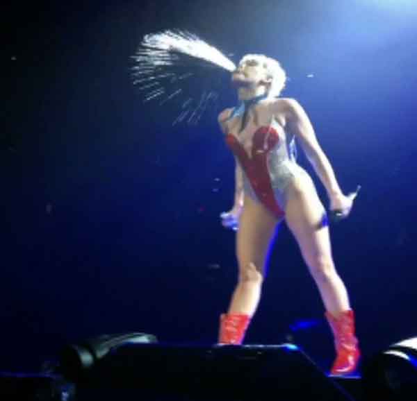 엽기적인 퍼포먼스로 유명한 마일리 사이러스(22)가 20일(현지 시간) 미국 플로리다주 탬파에서 열린 공연에서 물을 내뿜는 퍼포먼스를 펼쳐 화제가 됐다.