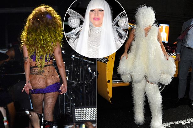 레이디 가가의 뒷 모습을 찍은 두 장의 사진중 하나는 지난 주말 뉴욕 공연때 보여준 퍼포먼스의 한 장면. 속이 완전히 비치는 그물 패션으로 등장한 가가가 보라 색상의 팬티를 내리는 모습을 담았다.