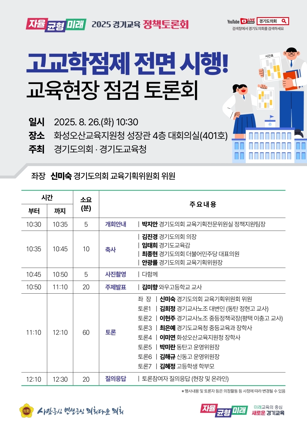 한편, 토론회는 경기도의회와 경기도교육청이 공동으로 주최하며 누구나 사전 신청없이 현장 참석 또는 유튜브 생중계를 통해 참여가능하다.