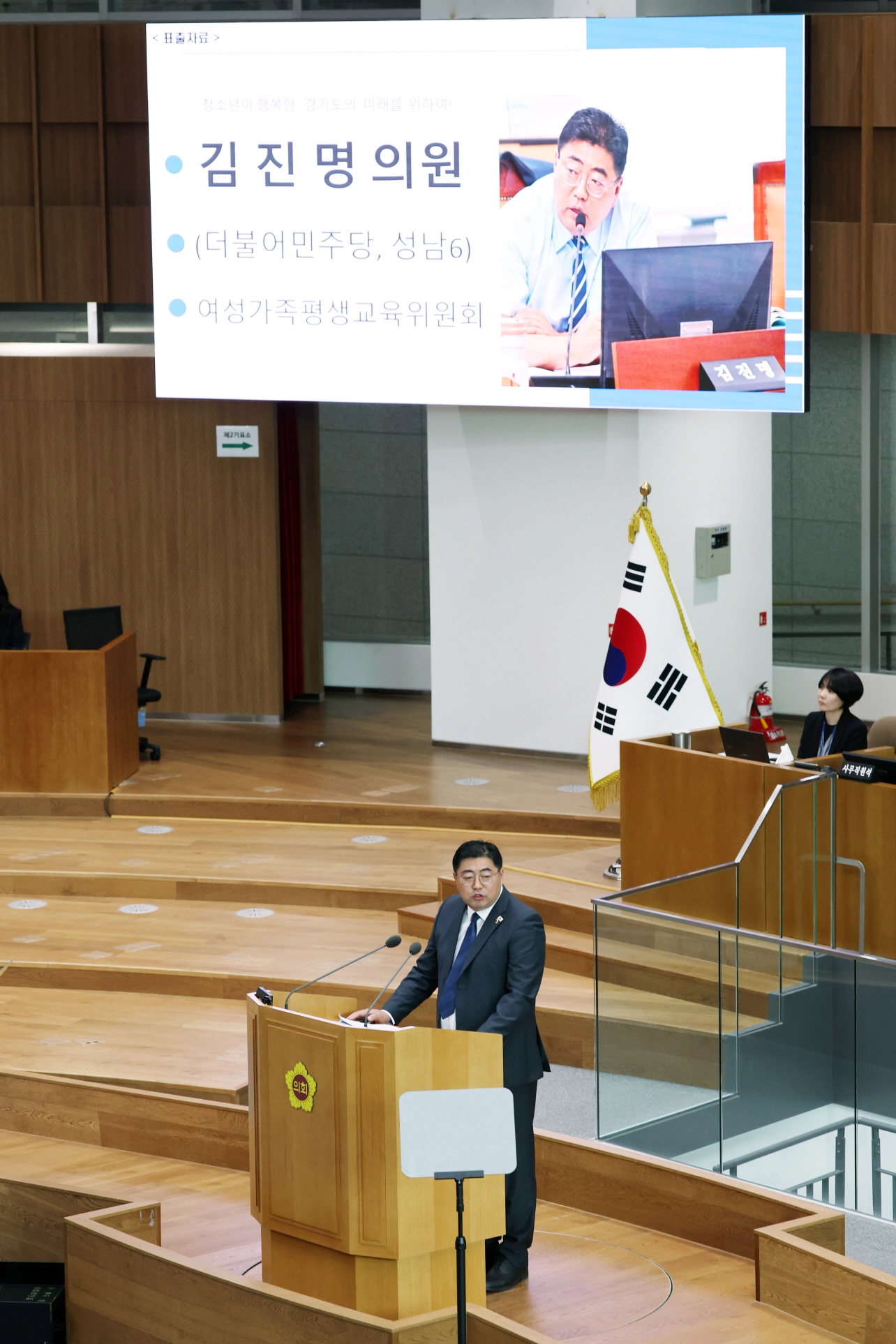 경기도의회 여성가족평생교육위원회 김진명 의원(더불어민주당, 성남6)은 11월 6일(목) 제387회 정례회 제3차 본회의에서 김동연 도지사와 임태희 교육감을 상대로 도정 및 교육행정 전반에 대한 대집행부질문을 진행했다.