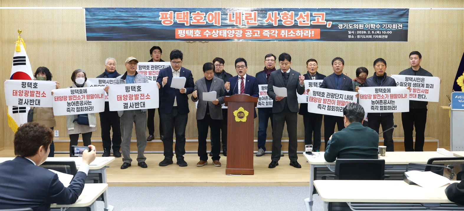 이학수 의원이 5일 기자회견을 열고 평택호 수상태양광 사업을 반대하는 평택시 각종 사회단체와 지역 주민들이 함께 한국농어촌공사가 발표한 평택호 수상태양광 사업 공고의 즉각적인 취소를 요구하고 있다.(사진=경기도의회)