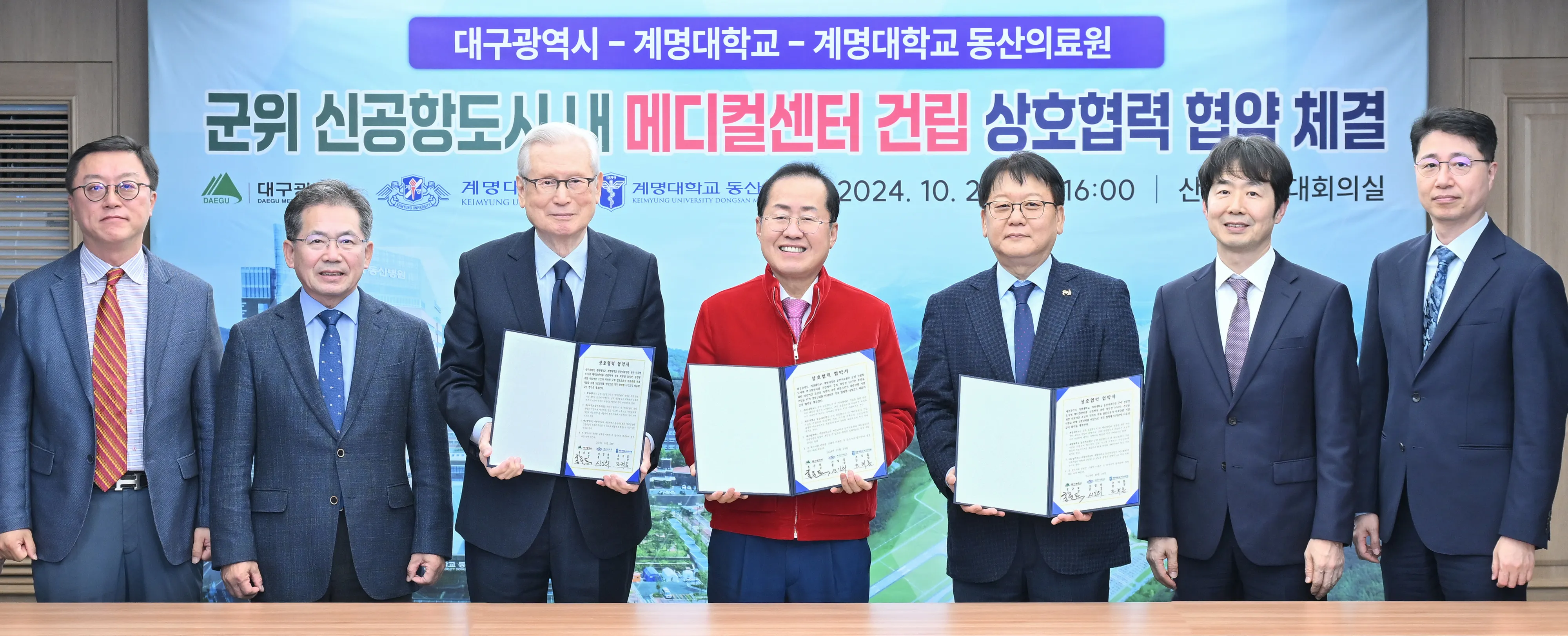 홍준표 대구시장은 메디컬센터가 신속히 지어질 수 있도록 전폭적인 지원을 약속했다. 홍 시장은 “메디컬센터 건립이 원활하게 추진되도록 행정·정책적 지원을 아끼지 않겠다”며 “계명대와 계명대 동산의료원 두 기관도 TK신공항 건설과 경북 북부권 100만 명 주민을 위한 메디컬센터 건립을 위해 적극적으로 노력해달라”고 당부했다.