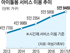 11일 여성가족부에 따르면 아이돌봄 서비스 이용 가구는 2011년 3만 7934가구에서 지난해 5만 8489가구로 6년 만에 54.2% 늘었다. 아이돌보미 수는 2만 3000명, 인건비 지원액은 지난해 기준 연간 1000억원 규모다. 이용자가 급증하자 정부는 돌보미 수를 4만 3000명으로 늘리기 위해 내년에 1000억원을 추가 투입하기로 했다.