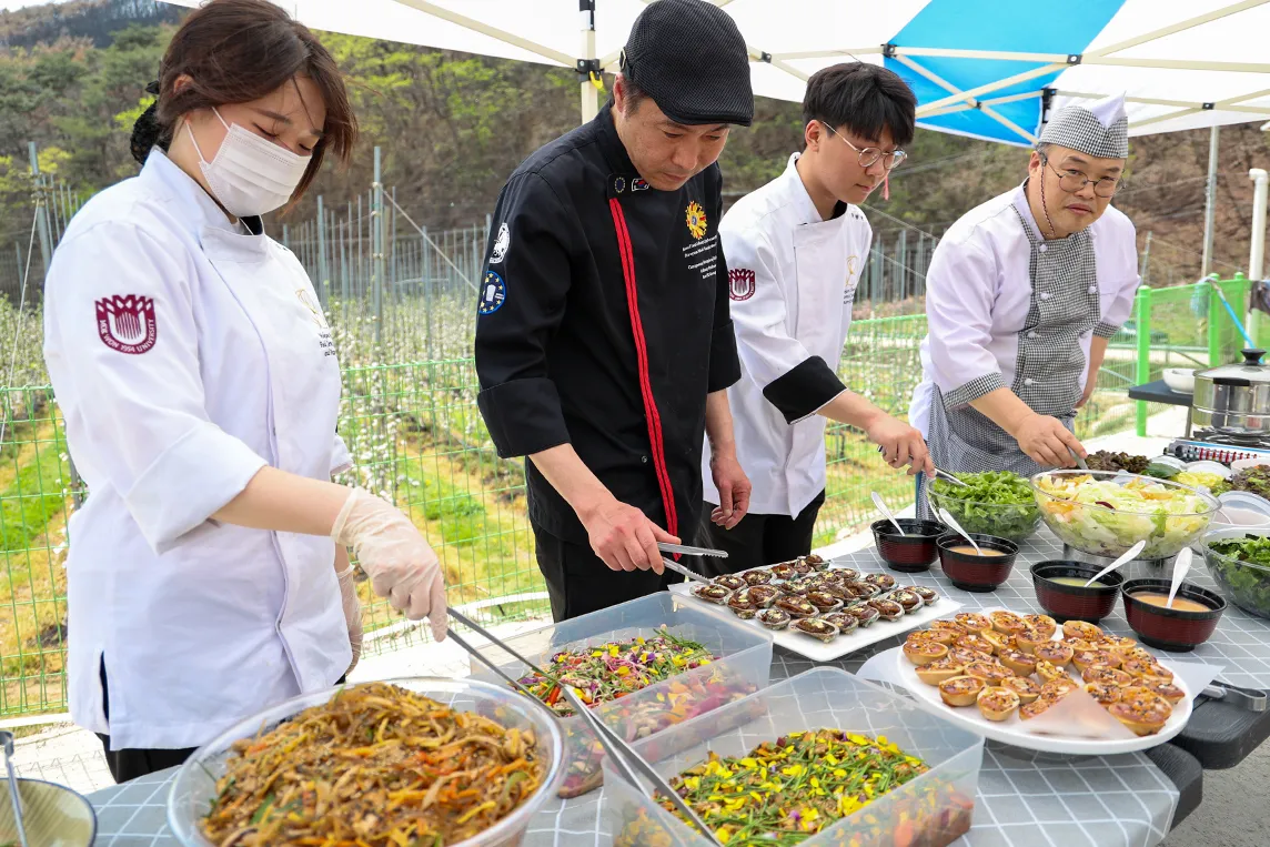 식사는 서양 조리 명장인 이기성 교수와 외식조리·제과제빵학과 학생들이 준비했다. 한식을 기본으로 세계 각국의 메뉴를 더한 요리 50여가지를 만들었다. 특히 주민의 불편을 줄이기 위해 현장 조리 과정을 최소화했다. 출발 전에 미리 음식을 만들어 현장에서는 간단한 조리 및 데워 제공하는 식으로 진행했다. 재난 현장 밥차 운영 경험이 풍부한 자원봉사협의회 관계자 등도 동참했다. 음식 조리를 총괄한 이기성 교수는 부친상으로 힘든 상황에서도 음식 준비를 진두지휘한 것으로 전해졌다.