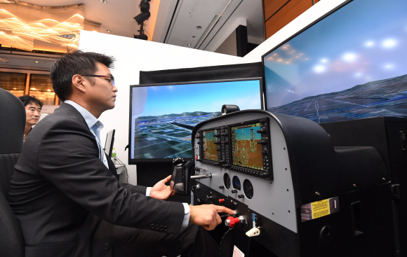 아시아 항공교육훈련 심포지엄  28일 서울 여의도 콘래드호텔에서 열린 ‘제2회 아시아 항공교육훈련 심포지엄(AAETS)’에서 관계자가 항공기 조종 시뮬레이터를 시연하고 있다. 2019. 6. 28. 박윤슬 기자 seul@seoul.co.kr