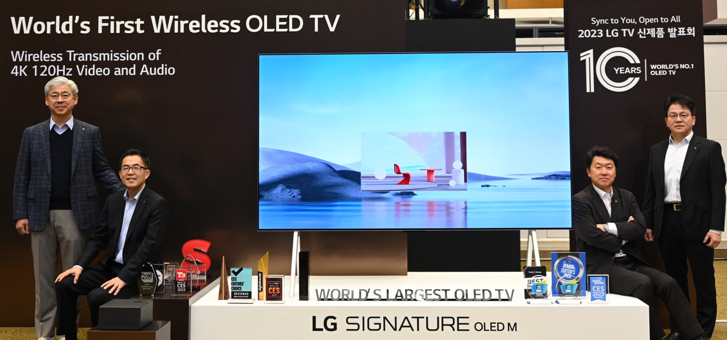 글로벌 TV 판매 1위 삼성전자의 OLED TV 시장 복귀를 지켜보는 ‘원조’ LG전자에는 시장 선도 기업으로서의 자신감이 묻어났다. 백선필 LG전자 HE(홈엔터테인먼트) 상품기획담당 상무는 8일 2023년형 올레드 TV 제품군을 공개하는 자리에서 삼성과 관련한 질문에 “프리미엄 시장 성장을 이끌 수 있어 환영할 일”이라고 말했다.