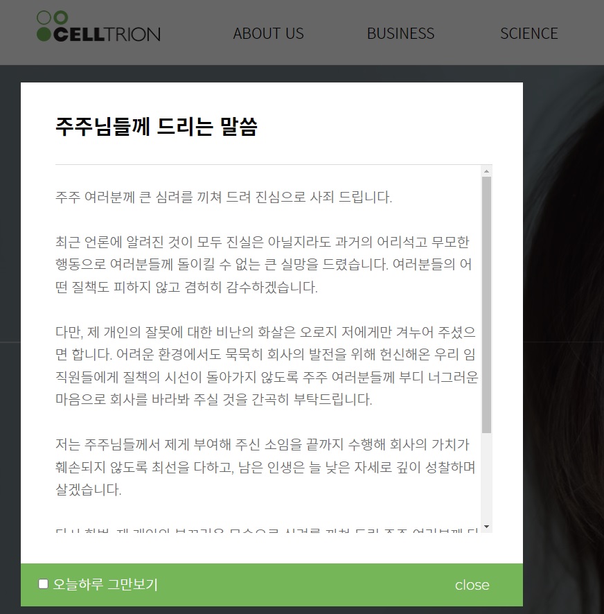 그러면서 “개인의 부끄러운 모습으로 심려를 끼쳐 드린 주주 여러분께 다시 한번 정중히 고개 숙여 사죄드린다”고 거듭 사과했다.