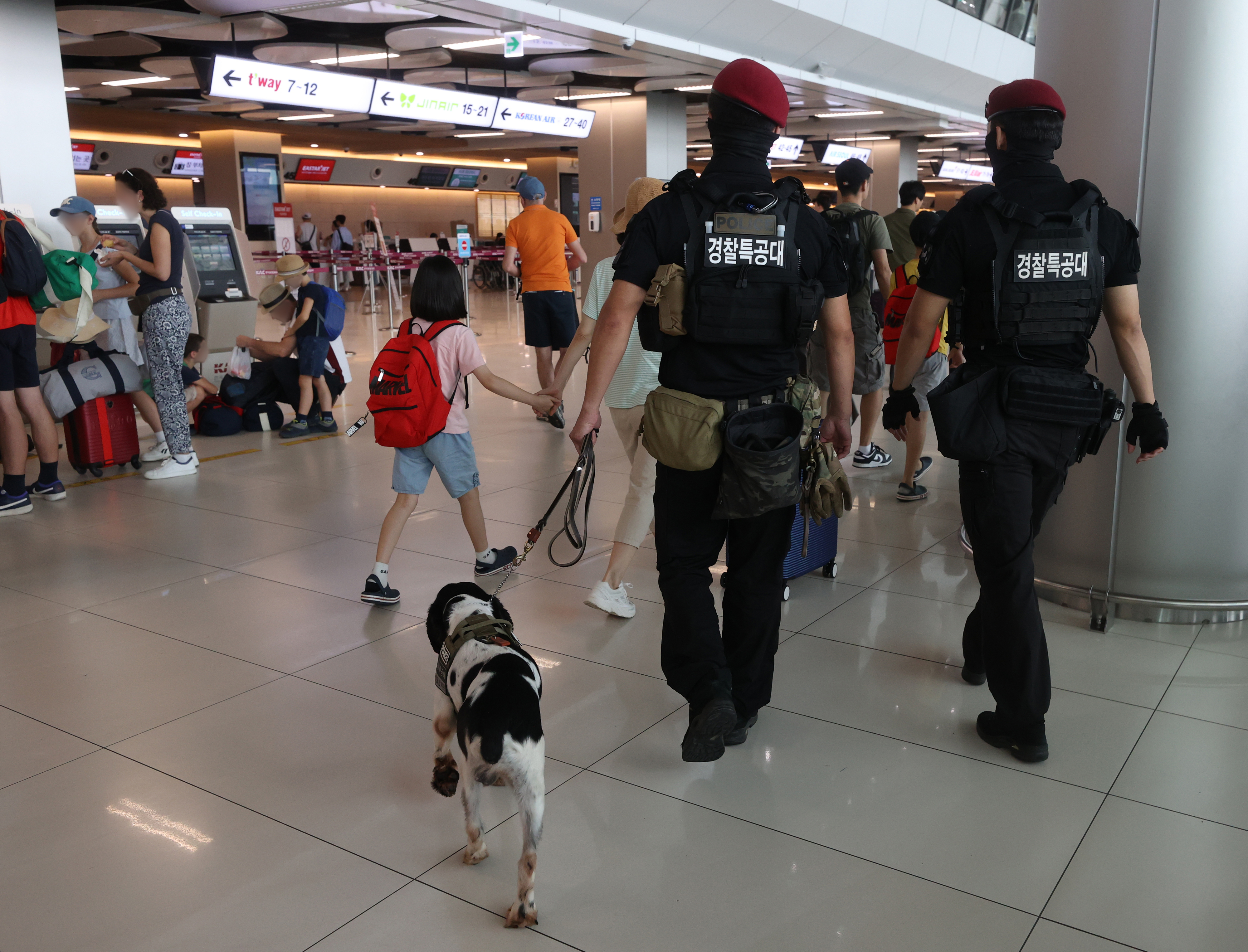 연이은 공항 테러 예고에 삼엄해진 경비 7일 오전 서울 강서구 김포국제공항 국내선 출국장에서 경찰특공대 대원들이 폭발물 탐지견과 함께 순찰을 돌고 있다. 경찰에 따르면 전날 오후에는 제주공항 폭탄테러 예고 글이 인터넷 사이트에 게시됐고, 이날 오전에는 김해공항과 관련된 테러 예고 글이 인터넷 커뮤니티에 올라왔다. 경찰은 테러를 의심할 만한 정황은 없었다며 허위 게시물에 대해서 엄중 처벌할 계획이라고 밝혔다. 2023.8.7. 연합뉴스