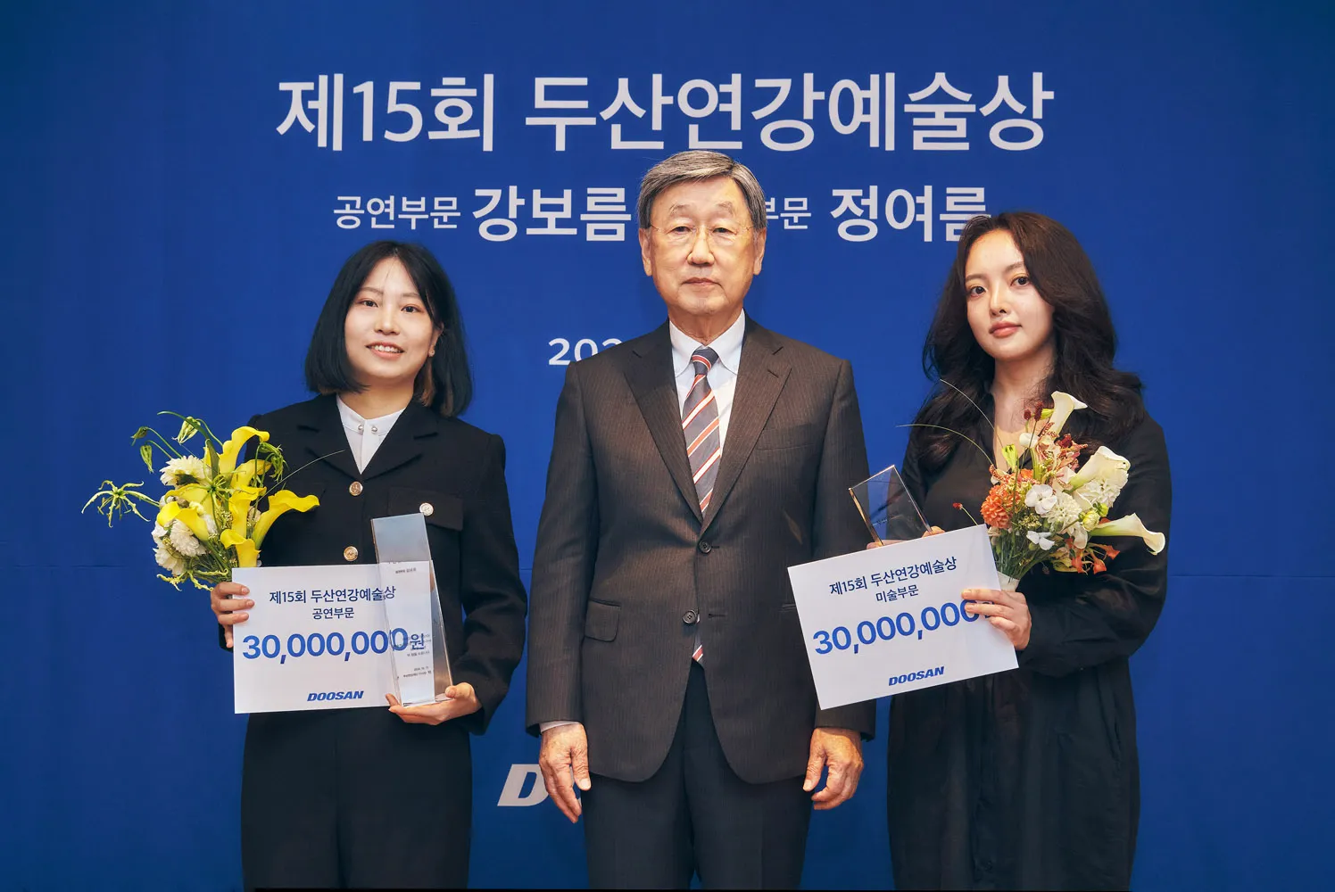 두산연강재단이 제15회 두산연강예술상 수상자로 공연 부문 강보름 연출가와 미술 부문 정여름 작가를 선정했다고 16일 밝혔다. 재단은 전날 서울 중구 소공동 롯데호텔 서울에서 시상식을 열고 박용현 두산연강재단 이사장이 수상자들에게 트로피와 상금 각 3000만원을 수여했다. 수상자들은 총 2억 9000만원 지원받는다. 강 연출가에게는 상금 외에 신작 공연 제작비로 1억 5000만원을, 정 작가에게는 두산 갤러리 전시 비용과 해외 레지던시 입주, 체류, 항공비 등으로 8000만원을 지원한다.