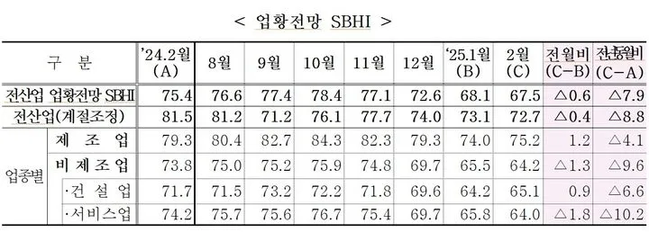 30일 중소기업중앙회가 발표한 ‘2025년 2월 중소기업 경기전망조사’에 따르면 2월 업황전망 경기전망지수(SBHI)는 67.5로 전월대비 0.6포인트 하락했다. 이번 조사는 지난 13~17일 3070개 중소기업을 대상으로 이뤄졌다.