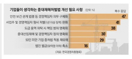 국내 기업 10곳 중 8곳 이상이 중대재해처벌법(중처법)을 개정해야 한다고 봤다. 2022년 1월 27일 중처법 시행 이후 기업의 63%가 안전 업무 수행 인력을 늘렸다고 밝혔지만, 실효성이 낮다는 지적이 나오면서 개선을 요구하는 목소리가 커지고 있다.
