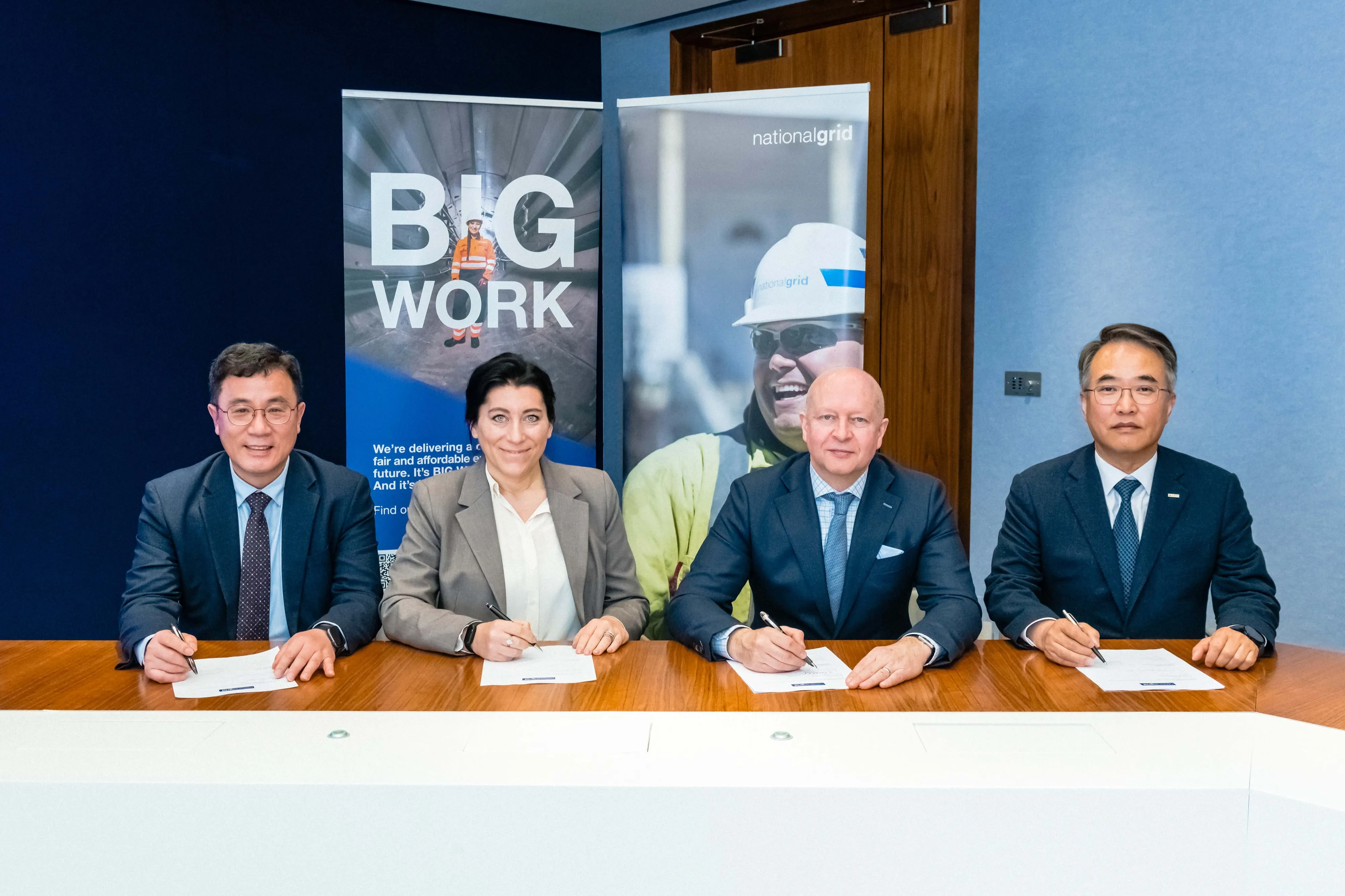 송종민(오른쪽) 대한전선 부회장이 지난달 18일(현지시간) 영국 런던 내셔널그리드 본사에서 칼 트로웰(오른쪽 두 번째) 내셔널그리드 전략인프라 부문 사장과 HVDC 프레임워크 계약을 체결하고 있다. 맨 왼쪽은 남정세 대한전선 에너지해외사업부 본부장. 대한전선 제공
