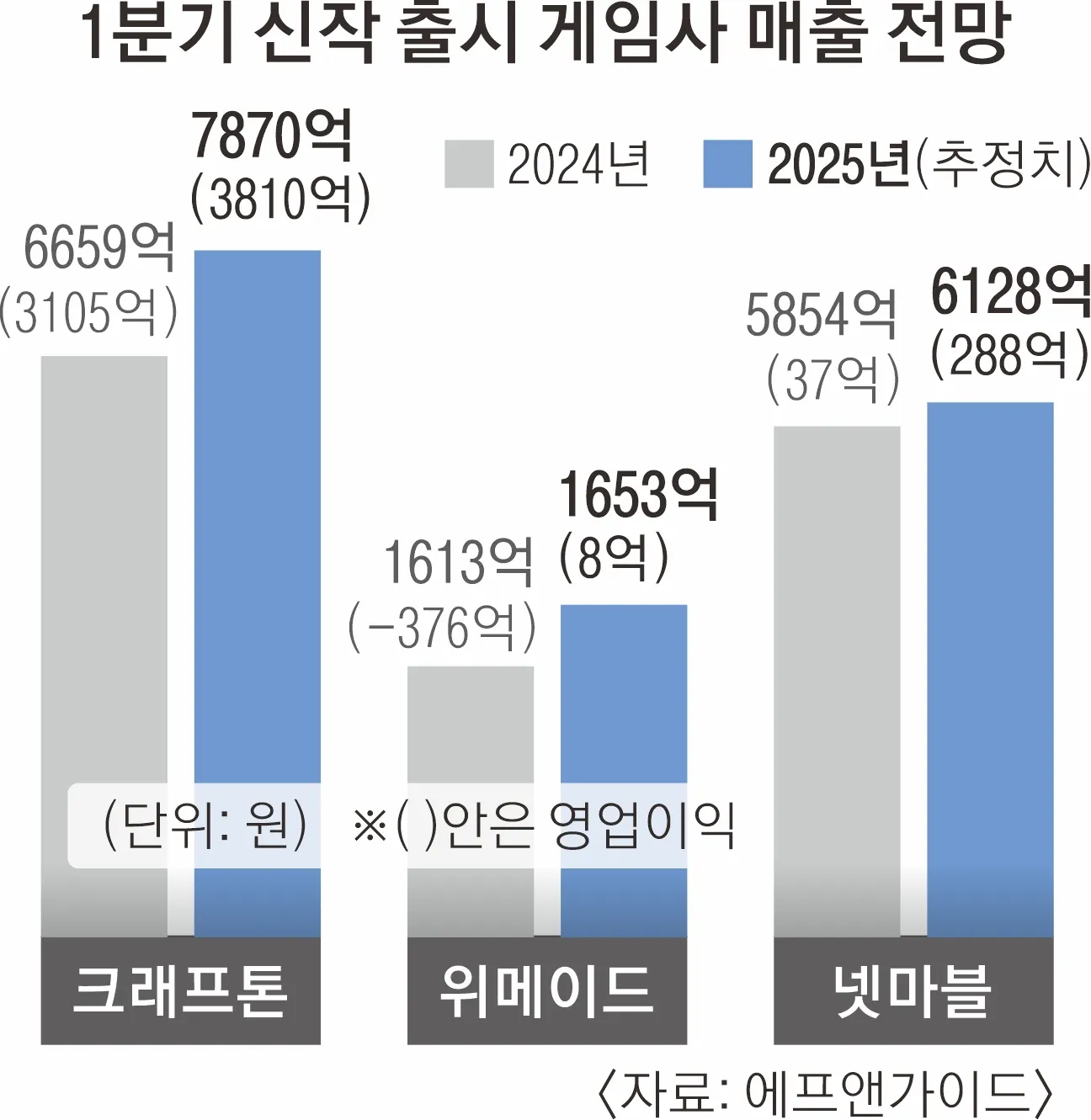 지난해 1분기 적자를 기록했던 위메이드 역시 신작 ‘레전드 오브 이미르’로 매출 상승과 함께 흑자 전환이 전망되고 있다. 에프앤가이드의 1분기 실적 컨센서스는 매출 1653억원으로 지난해 1분기 대비 2.5% 늘었고, 영업이익은 같은 기간 -376억원에서 8억원으로 흑자 전환을 할 것으로 보인다.