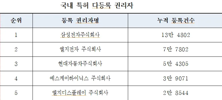 특허 다 등록 1위는 전체 특허의 5.0%(13만 4802건)을 보유한 삼성전자다. 1969년 전자 사업에 뛰어든 삼성전자는 이후 반도체와 모바일 기기 등에서 전 세계를 대표하는 기업으로 성장하며 다양한 기술을 보유하게 됐다. 이어 LG전자(7만 7802건), 현대자동차(5만 4305건) 순이다.