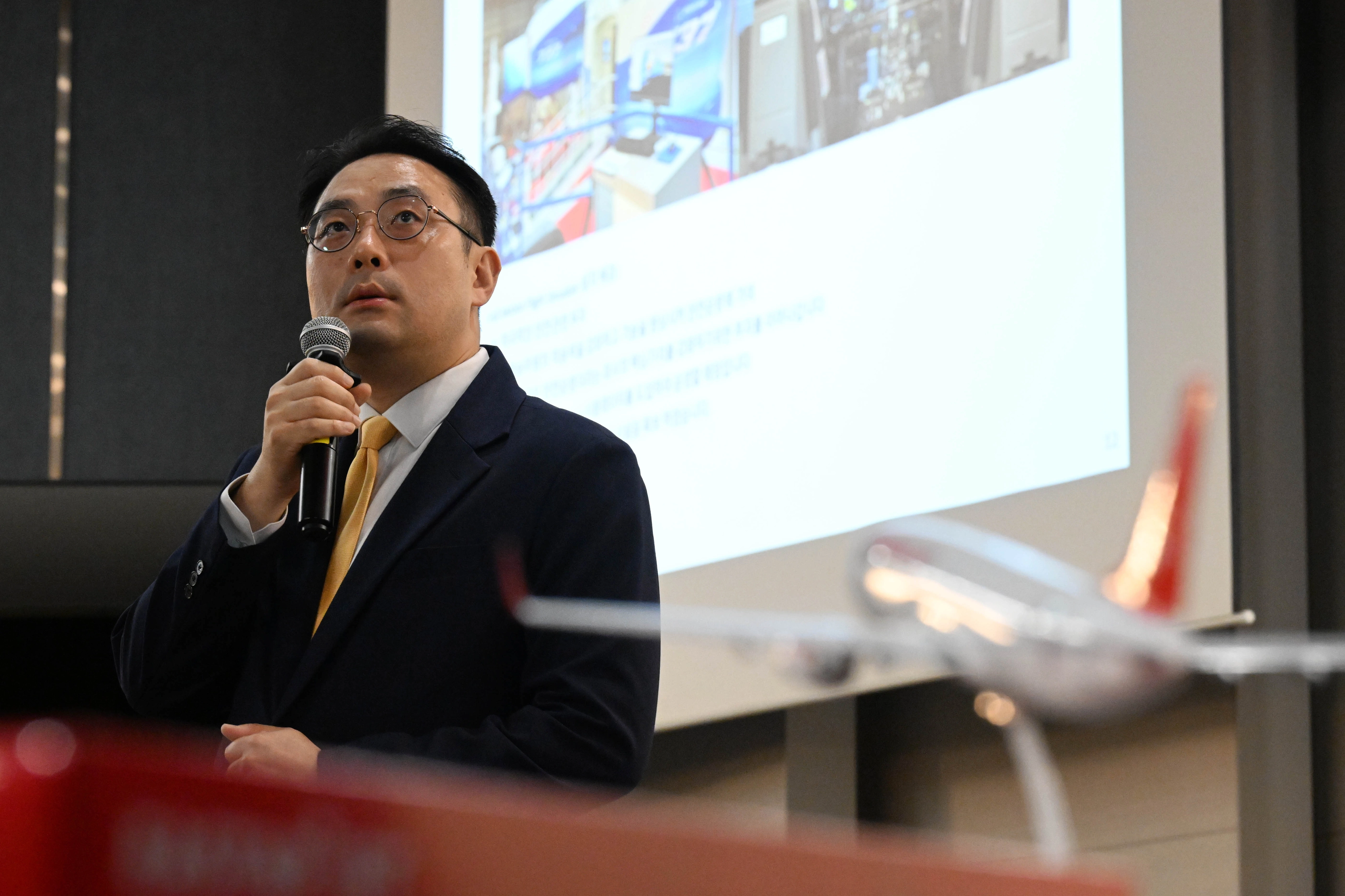 이경민 이스타항공 커머셜본부장이 3일 부산 상공회의소에서 ‘부산에서도 이스타항공!’ 노선 설명회를 갖고 있다.
