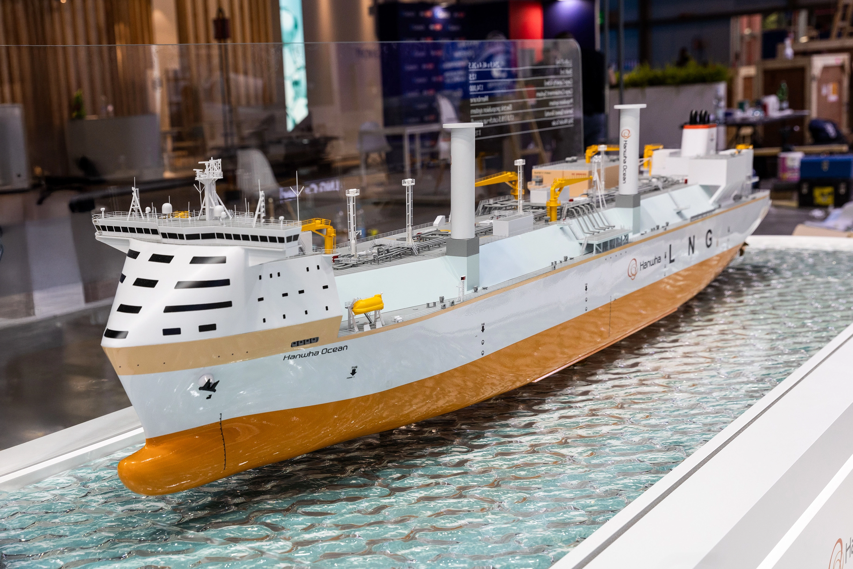 한화오션은 이번 전시에서 17만 4000CBM급 무탄소 LNG운반선 모형을 선보였다. 이 선박은 암모니아 가스터빈을 기반으로 한 전기추진 기술을 적용해 점화용 파일럿 오일조차 사용하지 않는 완전한 무탄소 추진을 목표로 하고 있다. 여기에 세계 최초로 개발한 액침냉각형 ESS를 결합해 전기 추진선박의 안정성과 신뢰성을 크게 높였으며, 선박용 수소연료전지와도 연계해 무탄소 동력 체계를 구체화했다. 또 한화오션은 전 세계 최다 건조 실적을 보유한 쇄빙LNG운반선, 1만 8000CBM급 LNG 벙커링선, 그리고 세계 최초의 LNG-FPSO 등 다양한 제품의 모델 전시를 통해 상선과 해양플랜트 분야에서 독보적인 경쟁력을 선보였다.