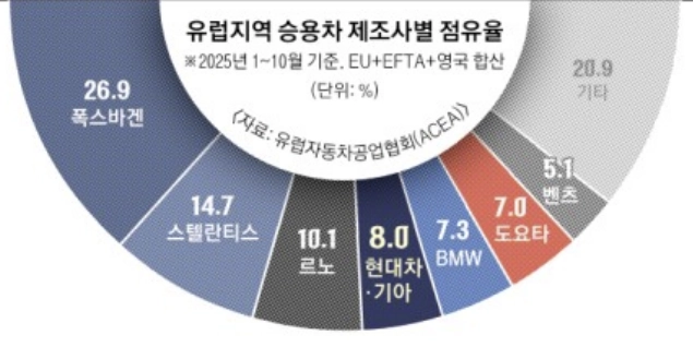 17일 유럽자동차공업협회(ACEA)에 따르면 올해 1~10월 유럽 지역에서 판매된 승용차는 1102만 514대로, 현대차그룹(현대차·기아)은 이중 87만 9479대를 판매해 8.0%를 차지했다. 폭스바겐그룹(26.9%), 스텔란티스(14.7%), 르노그룹(10.1%)에 이은 4위로 지난해 같은 기간 판매량(90만 4712대)보다 2.8% 줄었다. 또 점유율도 0.4%포인트 감소했다.